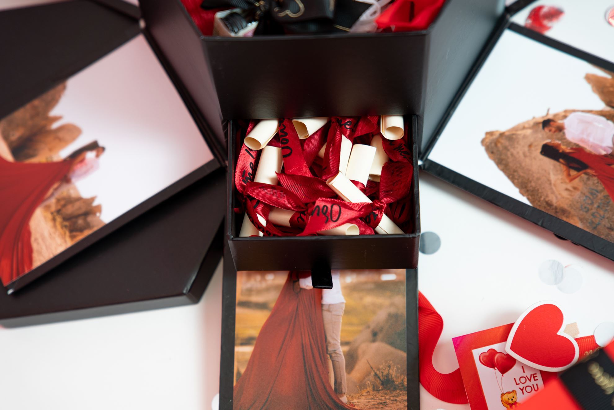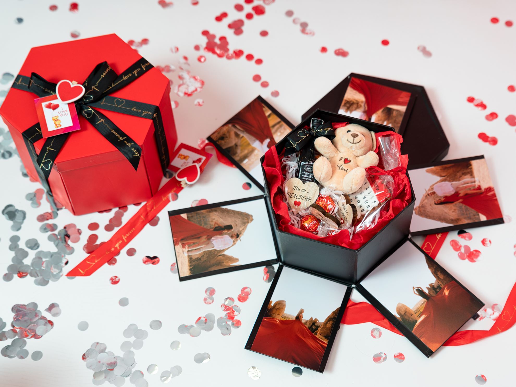 Кутия с шест Ваши снимки + уиски Jack Daniels 50 мл. + бисквитка любовно календарче + бонбони Линдор + плюшено мече I love you ❤️ + три персонализирани дървени сърчица + причини да те обичам (в скрито шкафче) + любовно послание (на капака на кутията) и картичка.