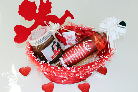 Включва: любовна кошничка с персонализирано вино с текст (бяло или червено ) + персонализиран със снимка шоколад Nutella 400 гр.